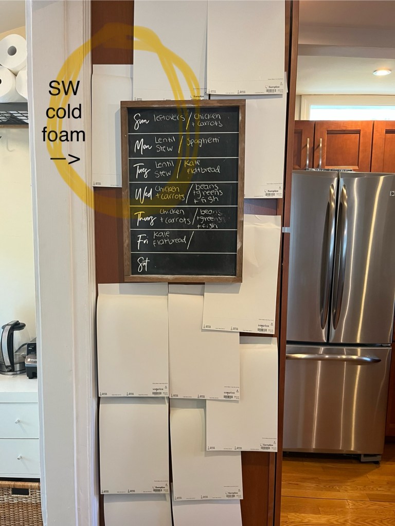 I must have ordered more than a dozen white paint swatches from Samplize. Our kitchen gets very little natural light, so it was important for the color to look flattering in artificial lighting. Prior to pulling samples, I was leaning towards BM White Dove because I’d seen so many beautiful photos of it online. However, our painter said he preferred Sherwin Williams paint for cabinets, so I pulled a bunch of SW samples as well. In the end it was between SW Heron Plume (more off-white) or SW Cold Foam (a slightly brighter white). Given the lack of natural light, we opted to play it safe and go with SW Cold Foam.