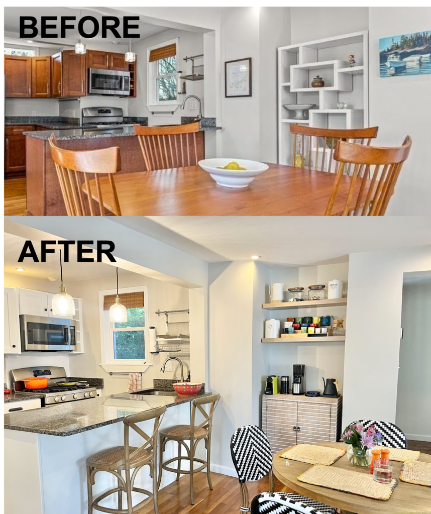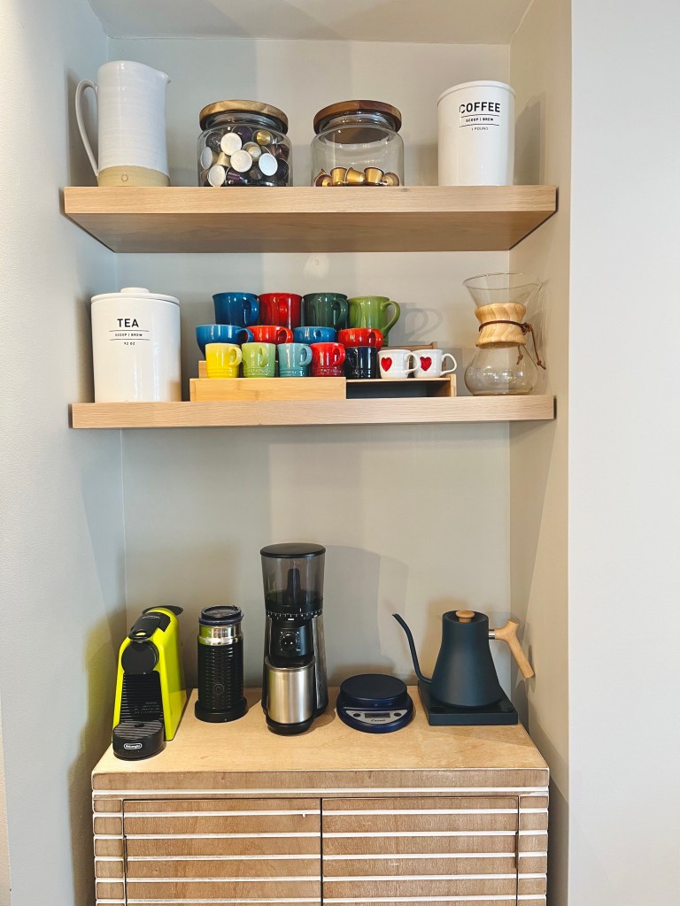 When home shopping, the previous owners of our home had staged this nook in the dining room with a decorative bookcase. But once we noticed the wall outlet and the close proximity to the sink, the wheels started turning. Transforming this roughly 3 square feet of real estate into a functional coffee bar was one of our very first house projects after moving in, and one we’re still enamored with a year later.