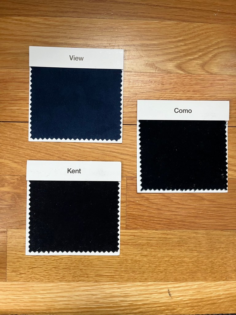 There were 3 navy velvet fabric options: Kent in Admiral, Como in Navy, and View Microfiber in Navy. The Como wasn’t a performance fabric and it added an extra thousand dollars or so to the already expensive price tag, so that was an easy one to omit. I loved the feel of the Kent Fabric in Admiral, but it was so dark that it looked black from some angles. Microfiber sofas have a distinct look that I’m not always a fan of, but the sales associate really talked up the View fabric as incredibly durable and my husband and I both really like the color so we decided to go for it.