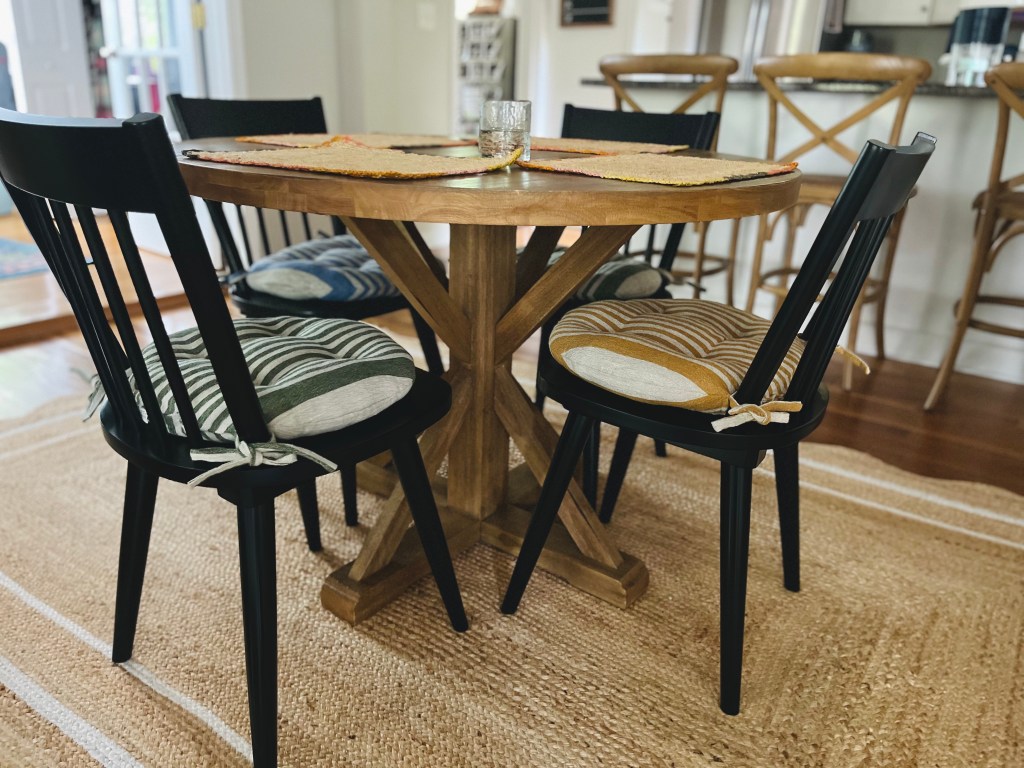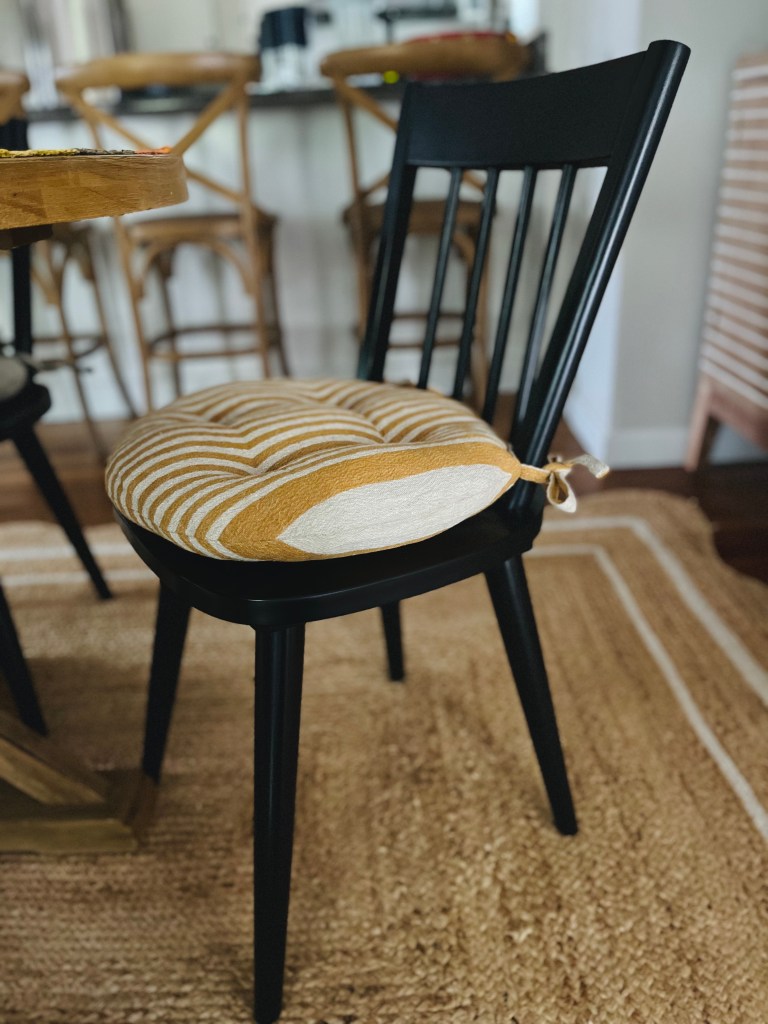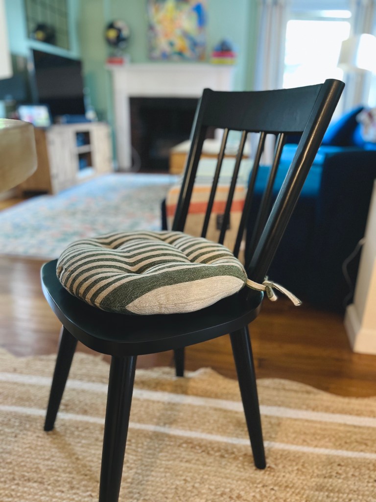 Because the chairs read a little more modern, I wanted to add some softness and lean into the traditional roots of the Windsor chair style by adding a patterned cushion. I ordered these cushions on Etsy in the 15.7″ round size in Green Stripes II, Blue Stripes, and Yellow Stripes. I am so happy with how they turned out! If I had an unlimited budget, the plan would have been to source custom-made cushions in something like Lost and Found or Espadrille. (See more of my favorite fabrics here!) But honestly, these Etsy cushions were exactly what this room needed.