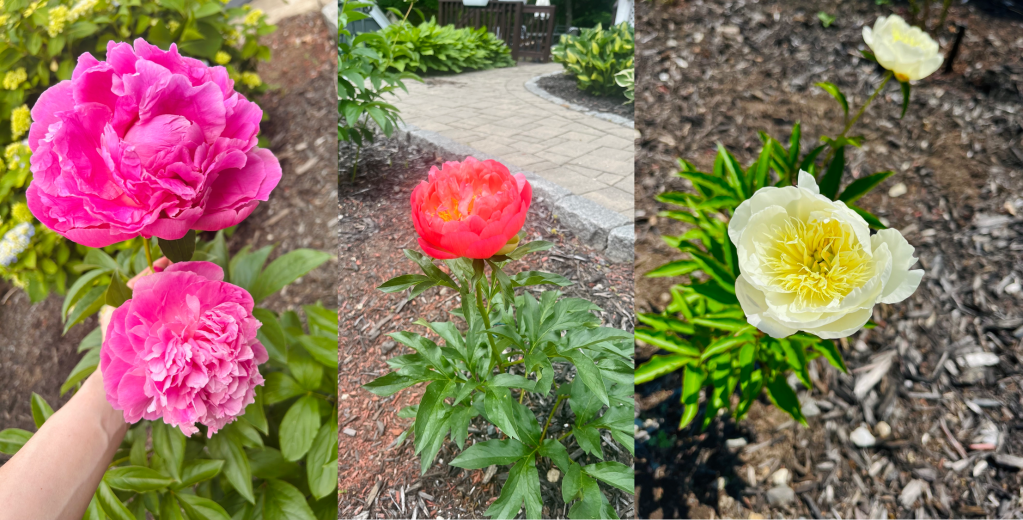 ^ From left: Jacorma peony (planted spring 2024), Coral Charm Peony (planted spring 2024), Jan Van Leuween Peony (planted fall 2024)