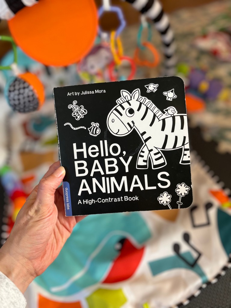 High contrast books are ideal for the first couple of months when newborns are more nearsighted. I read this book to baby multiple times per day for the first three months or so, starting when we brought him home from the hospital, to help build the reading habit. He quickly took to it and would often smile when we brought it out, and we still mixed this book in every now and then in the months that followed since it was familiar.
