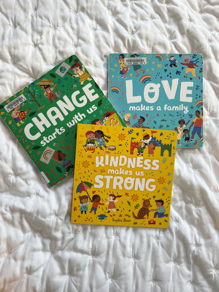 Kindness Makes Us Strong is right up there with Little Blue Truck in terms of books that baby LOVES and are guaranteed to hold his attention. We enjoy it so much that I checked out Sophie Beer’s other books too. She has several, but Love Makes a Family and Change Starts with Us are my other two favorites that I highly recommend. These books are really simple and short yet really impactful and positive.