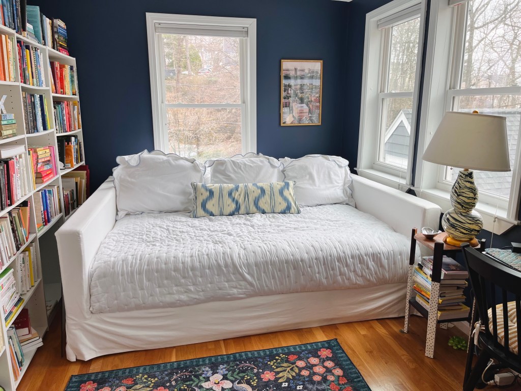 Our guest room also pulls double duty as a home office, so it was a puzzle to figure out how to incorporate both a bed and a desk without feeling like a teenager doing zoom school from my bedroom. The solution came in the form of the Jamie Slipcovered Daybed from PB Teen, which looks more like a cozy reading nook than a standard bed, but comes in a queen size which is ideal for hosting. I was torn on how many throw pillows to style the bed with because the queen size is comically deep for a daybed, but after playing around with it I’m happy with where things ended up.